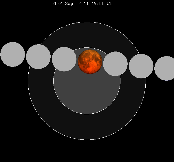 2044년 8월 23일 개기일식은 달의 그림자가 지구 표면을 가로지르며 여러 단계를 거쳐 진행된다.[5] 일식의 상세 정보는 아래 표와 같다.