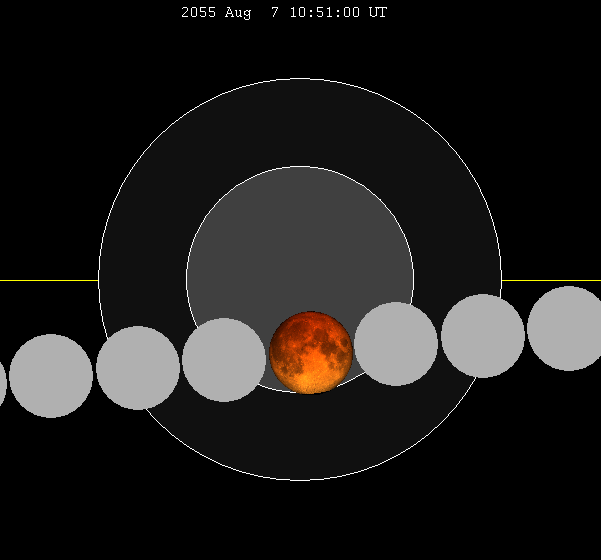 2055년 7월 24일에 일어나는 개기일식에 대한 상세 정보는 다음과 같다. 아래 표는 달의 반그림자 또는 본그림자가 특정 매개변수에 도달하는 시간과, 이 일식과 관련된 다양한 다른 매개변수를 설명한다.[3]