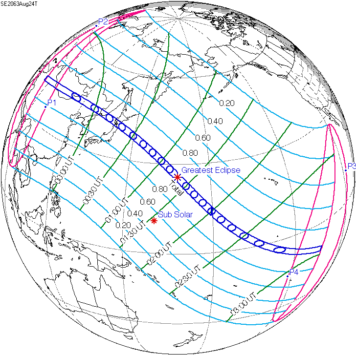 최대 일식 | 2063년 8월 24일 01시 22분 10.6초 |