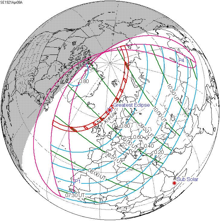 2004년 4월 19일 일식은 달의 반그림자가 지구에 닿아 시작되었으며, 최대 일식 등급은 0.73674였고, 사로스 119 주기의 일부로 18년 11일 주기로 반복된다.