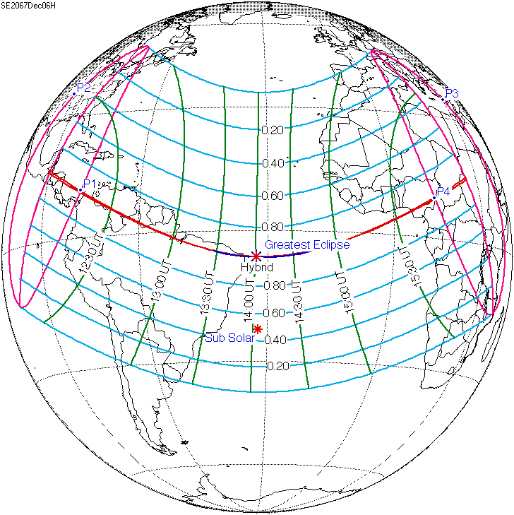 2067년 12월 6일 혼성일식은 달의 반그림자 또는 본그림자가 특정 매개변수에 도달하는 시간과, 이와 관련된 여러 매개변수를 두 개의 표로 나타낸다.[3]
