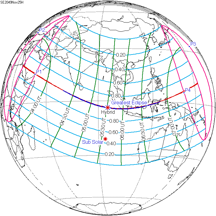 2005년 4월 8일 일식은 프레드 에스페낙과 제이 파사초프 등이 갈라파고스 제도 서쪽 해상에서 관측한 혼성 일식으로, 일식 시기의 일부이며 태양 사로스 129의 구성원이다. - 혼성일식 - 2023년 4월 20일 일식