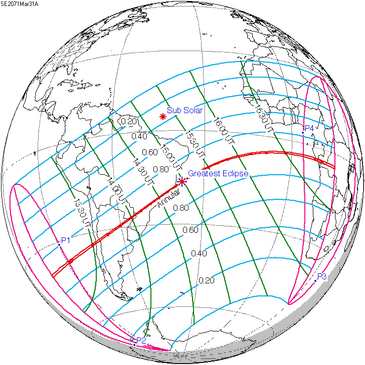 2071년 3월 31일에는 금환 일식이 일어난다. 이 일식에 대한 상세 정보는 달의 반그림자나 본그림자가 지구 표면에 닿는 시간, 그리고 일식과 관련된 여러 변수들을 포함한다.[3] 자세한 내용은 하위 섹션을 참고하면 된다.