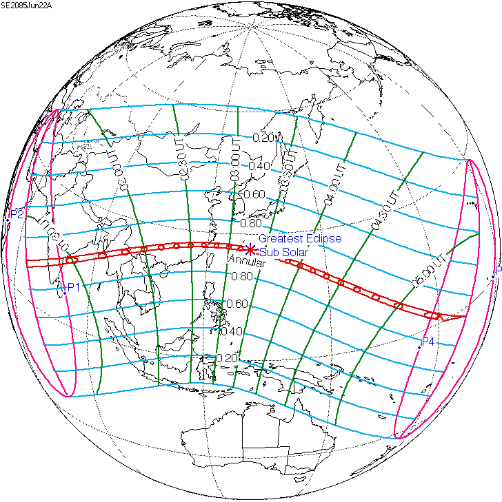 2085년 6월 22일에 일어나는 일식에 대한 상세 정보는 다음과 같다.[3] 일식 시간과 관련된 표는 하위 섹션 "일식 시간"에, 일식 매개변수와 관련된 표는 하위 섹션 "일식 매개변수"에 각각 제시되어 있다.