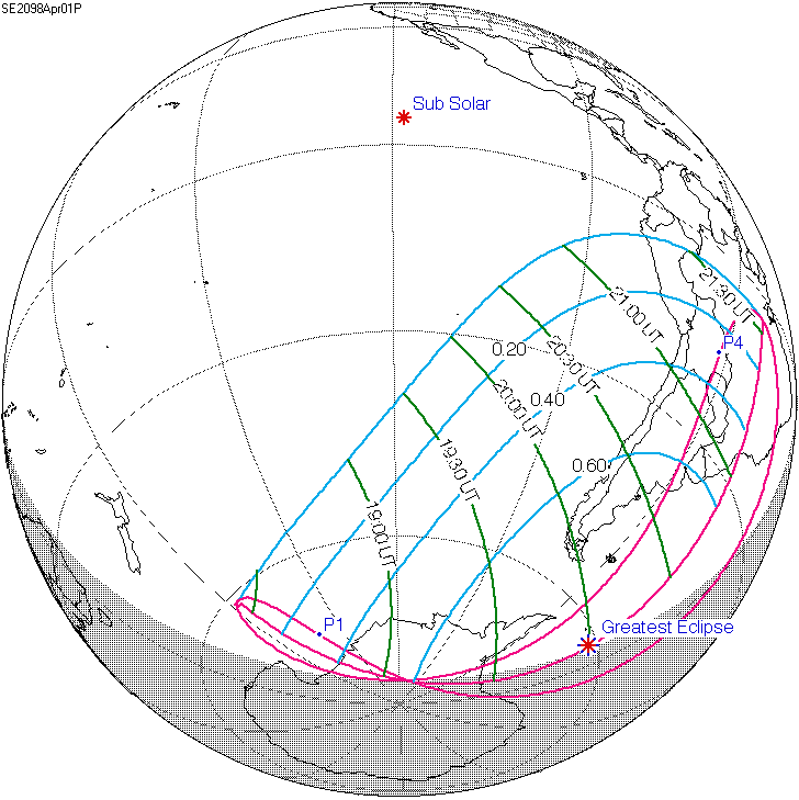 다음은 2098년 4월 1일에 일어나는 일식에 대한 상세 정보이다. 아래의 두 표는 각각 달의 반그림자 또는 본영이 특정 매개변수에 도달하는 시간과, 일식과 관련된 여러 매개변수 값을 보여준다.[2]