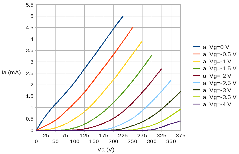 이미지에 표시된 특성 곡선의 예에서, 애노드 전압 Va가 200V이고 그리드 전압 바이어스가 -1V로 선택되면, 플레이트(애노드)에는 2.25mA의 전류가 흐른다(그래프의 노란색 곡선 참조). 그리드 전압을 변경하면 플레이트 전류가 변경된다. 플레이트 부하 저항을 적절하게 선택하면 증폭이 이루어진다.