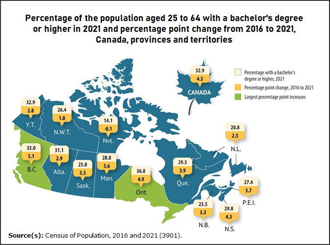 [52] 웹사이트 British Columbia and Ontario saw the largest percentage point increases in degree holders from 2016 to 2021 https://www150.statc[...] 2024-03-08