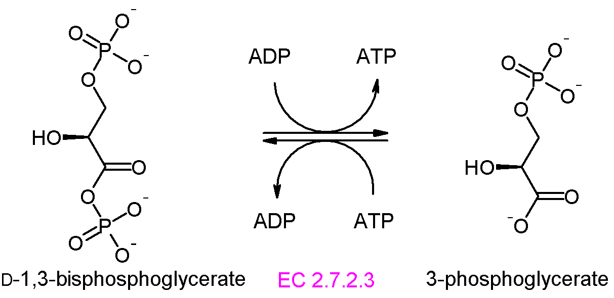 포스포글리세르산 키네이스는 1,3-비스포스포글리세르산에서 인산기를 전이시켜 3-포스포글리세르산과 ATP를 생성하는 반응을 촉매한다.포스포글리세르산 뮤테이스는 3-포스포글리세르산을 2-포스포글리세르산으로 이성질화시키는 반응을 촉매한다.