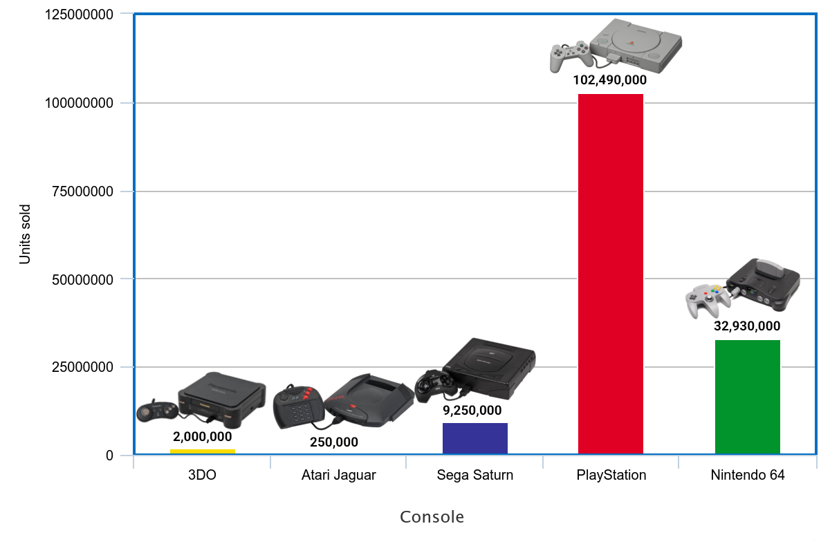 전 세계 판매량에서는 플레이스테이션이 1억 249만 대로 압도적인 1위를 차지했으며,[73] 닌텐도 64가 3,293만 대,[74] 세가 새턴이 926만 대로 그 뒤를 이었다.[75][76] 그 외 콘솔들의 판매량은 다음과 같다: 3DO (200만 대), 32X (80만 대),[77] 버추얼 보이 (77만 대), PC-FX (40만 대), 아타리 재규어 (25만 대),[78] 아미가 CD32 (10만 대), FM 타운즈 마티 (4만 5천 대),[79] 애플 반다이 파이핀 (4만 2천 대)[80]