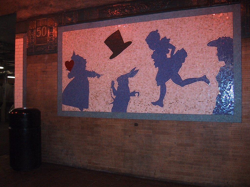 1994년, 릴리아나 포터의 "Alice, The Way Out"이 설치되었다. 이 작품은 루이스 캐럴이상한 나라의 앨리스 등장인물들을 묘사한 모자이크 시리즈이다.[60] 극장 지구에 위치한 역의 특징을 살려, 앨리스가 커튼을 뒤로 당기는 모습 등 극장과 관련된 이미지를 포함하고 있다.