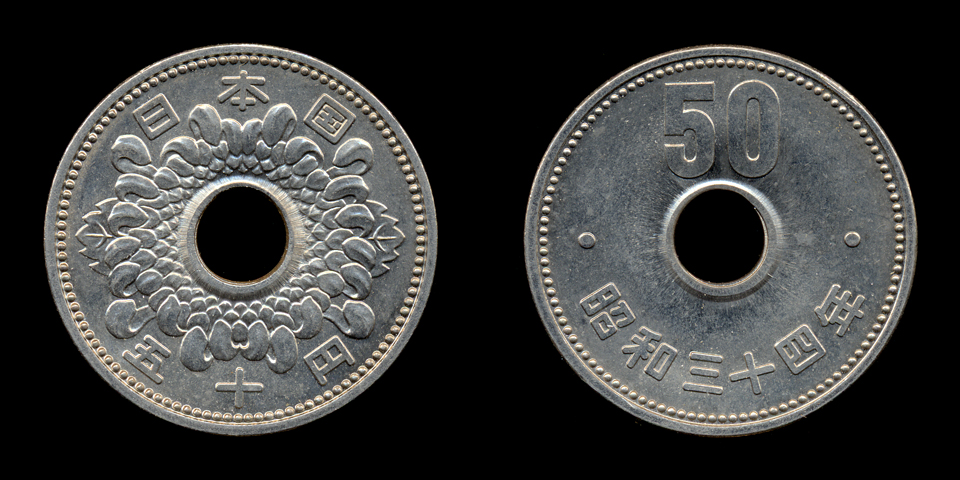 - 1959년: 100엔 은화와의 혼동을 막기 위해 디자인이 변경된 50엔 니켈화(유공) 발행이 시작되었다.[28] 가장 큰 특징은 동전 중앙에 지름 6mm의 구멍이 뚫린 것이다.[4] 소재와 지름은 이전과 같았으나 무게는 5g으로 줄었고, 테두리 톱니가 없어졌다. 앞면 도안은 정면에서 본 국화로 변경되었다. 1966년까지 제조되었다.