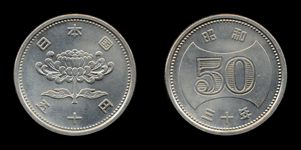 1955년 발행된 50엔 니켈화(무공)는 1958년까지 제조되었으며, 현재는 거의 유통되지 않는다.