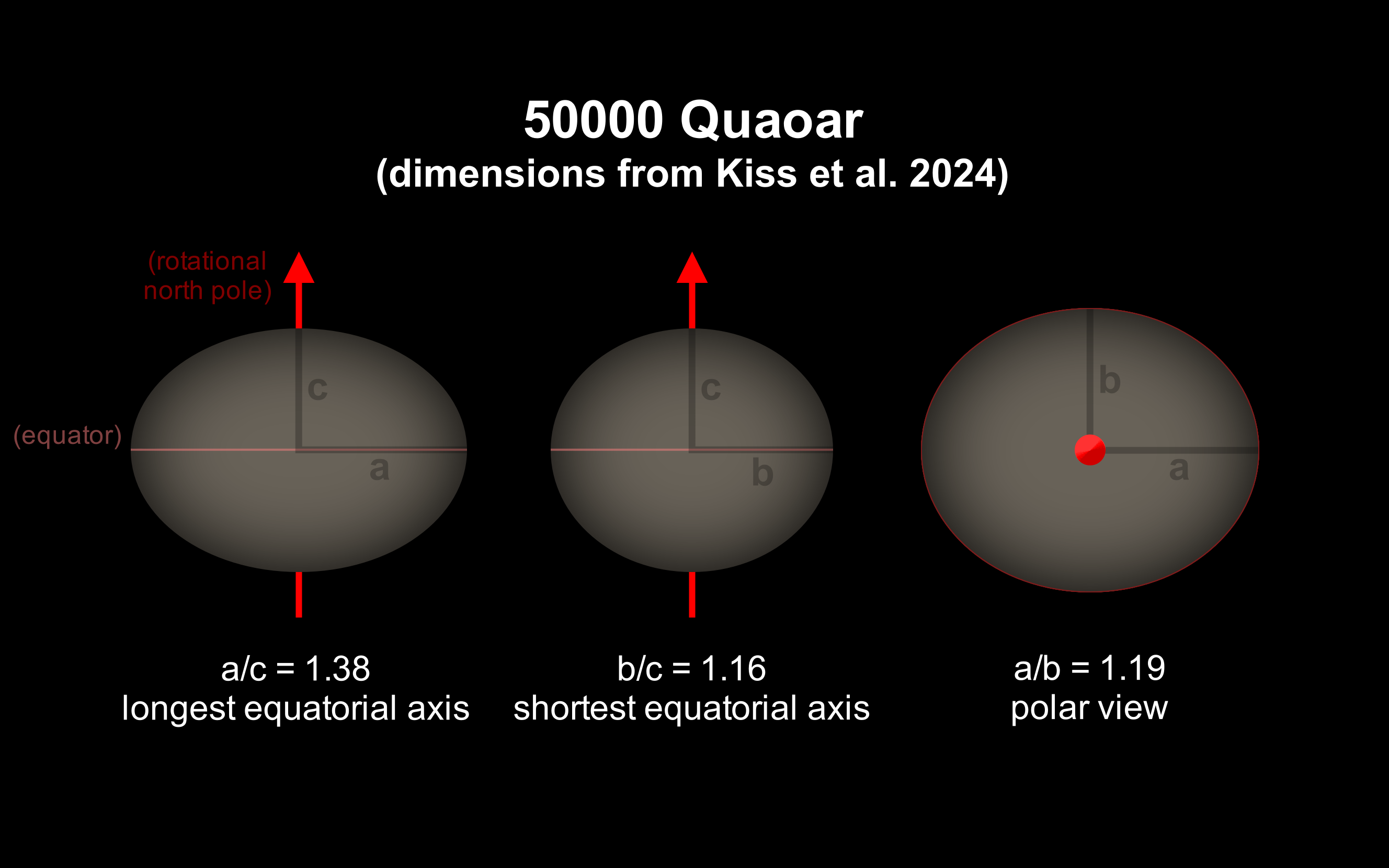 현재, 콰오아의 자전 광도 곡선과 별 엄폐를 통한 형상 측정 결과 콰오아는 평균 지름이 1090km인 삼축 타원체임을 보여준다. 콰오아의 지름은 명왕성의 약 절반이며 카론보다 약간 작다. 콰오아는 원적외선 열 복사와 가시광선의 밝기가 17.68시간마다 크게 변동하며, 이는 콰오아가 적도를 따라 길쭉하다는 것을 나타낼 가능성이 크다.2024년 차바 키스(Csaba Kiss)와 연구진의 분석 결과, 콰오아의 적도 축 길이는 19% (''a''/''b'' = 1.19) 차이가 나고, 극축과 가장 짧은 적도 축 길이는 16% (''b''/''c'' = 1.16) 차이가 나며, 이는 타원체 치수 1286km에 해당한다. 콰오아의 타원체 모양은 이전의 별 엄폐를 통한 크기 및 형상 측정과 일치한다.