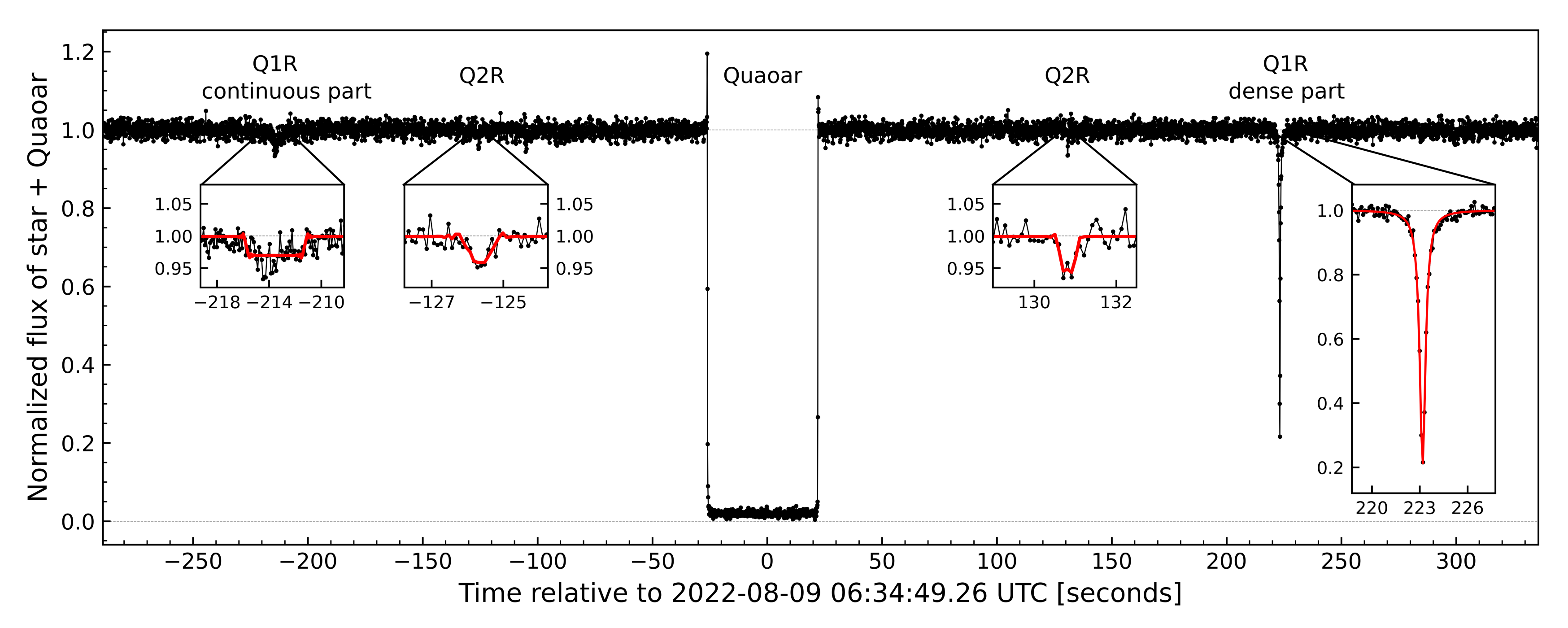 정확한 크기와 모양을 결정하는 것 외에도, 외태양계의 작은 천체 주위에 고리 및/또는 대기를 탐색하기 위해 장기적인 차원에서 별 엄폐 관측 캠페인이 계획되었다. 이 캠페인은 프랑스, 스페인, 브라질의 다양한 팀의 노력을 결집하여 유럽 연구 위원회 프로젝트 ''Lucky Star''의 지원을 받아 수행되었다. 콰오아의 최초로 알려진 고리인 Q1R의 발견에는 2018년에서 2021년 사이에 관측된 별 엄폐 동안 사용된 다양한 기기가 포함되었다. 나미비아의 고에너지 입체 시각 시스템(HESS)의 로봇 ATOM 망원경, 10.4m 그란 테레스코피오 카나리아스(스페인 라 팔마 섬), ESA CHEOPS 우주 망원경, 그리고 해왕성형 고리의 보고가 시작되었고 Q1R의 밀집된 호가 처음 관측된 호주 시민 천문학자들이 운영하는 여러 관측소가 그것이다. 이 관측 결과들은 콰오아 주위에 부분적으로 밀집되고 대부분 희미하며 독특하게 멀리 떨어진 고리의 존재를 보여주었으며, 2023년 2월에 발견이 발표되었다.