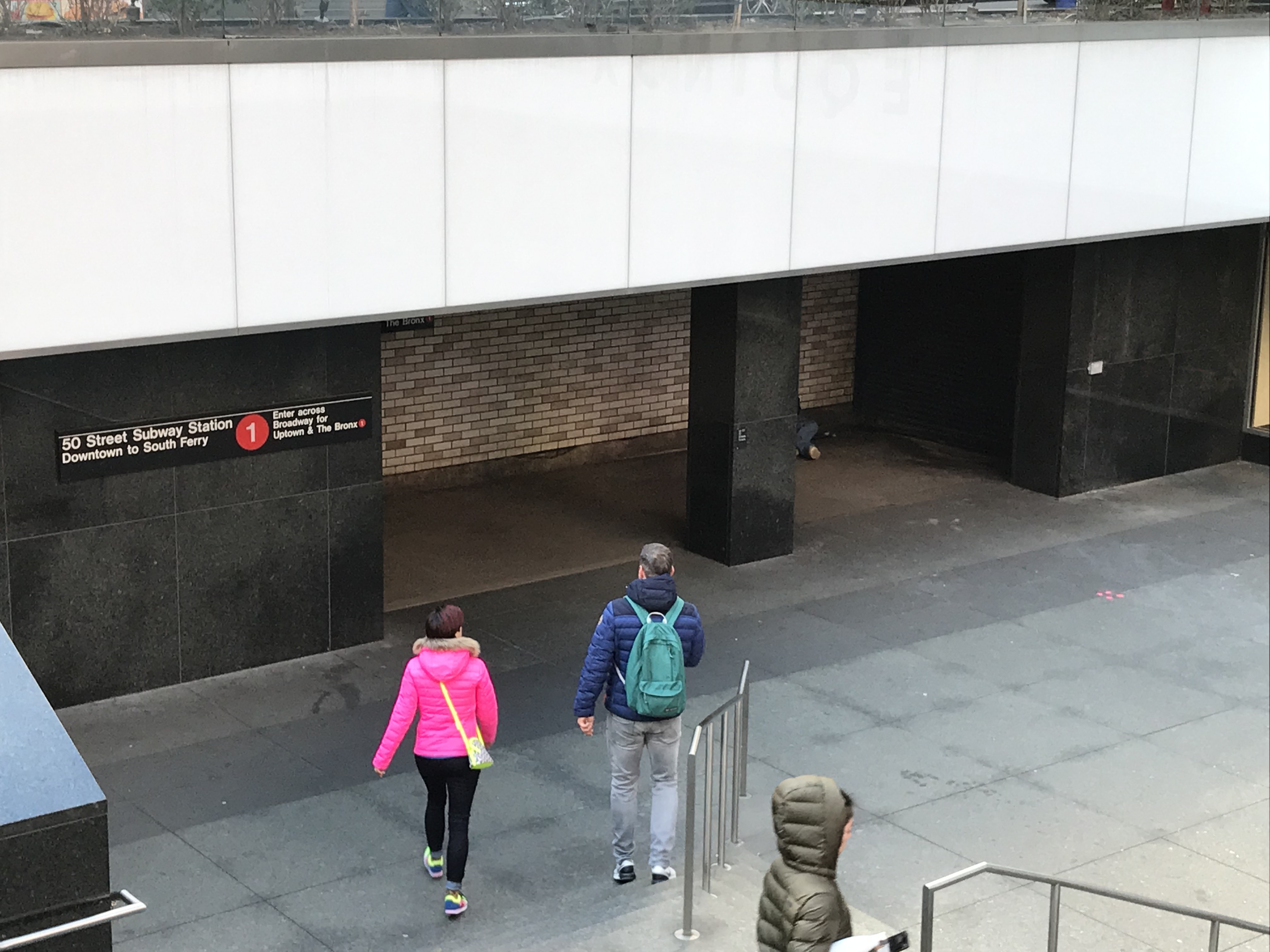 각 승강장 중앙에는 동일 층 운임 구역이 있으며, 방향 간 횡단 통로는 없다. 북행 승강장에는 50번가와 브로드웨이 북동쪽 모퉁이에 2개, 남동쪽 모퉁이에 1개, 브로드웨이와 7번가 사이 50번가 중간 블록 남쪽 건물 내부에 1개, 총 4개의 계단이 있다.[61]남행 승강장에는 브로드웨이 서쪽, 50번가 남쪽 출구에 지하 쇼핑 아케이드가 있고, 50번가와 브로드웨이 북서쪽 모퉁이 파라마운트 플라자 남쪽 움푹 들어간 안뜰로 나가는 출구가 있다.[61]