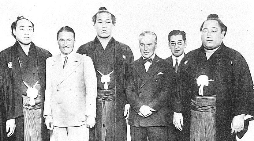 사건 당시 찰리 채플린(오른쪽에서 세 번째)과 스모 선수들