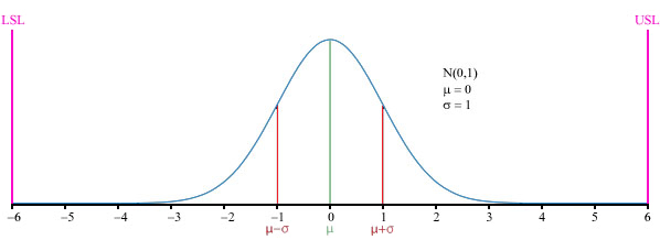 평균—μ (뮤)로 표시—과 가장 가까운 규격 한계 사이에 6개의 표준 편차—그리스 문자 σ (시그마)로 표시—가 있다고 가정한다. 공정 표준 편차가 증가하거나 공정의 평균이 허용 오차의 중심에서 멀어지면, 평균과 가장 가까운 규격 한계 사이에 더 적은 표준 편차가 들어가게 되어 시그마 숫자가 감소하고 규격 밖의 품목이 발생할 가능성이 증가한다.[8]