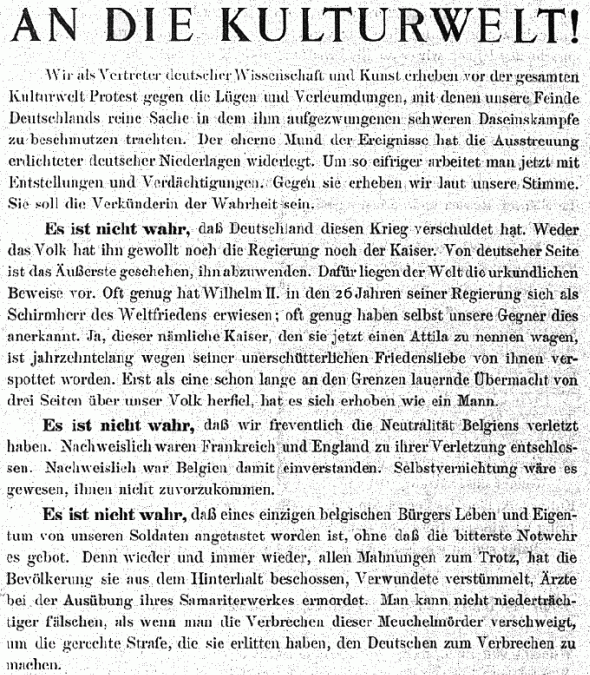 주요 서명자 | 아돌프 폰 바이어 페터 베렌스 빌헬름 폰 보데 알로이스 브란들 루요 브렌타노 프리츠 하버 엔겔베르트 훔페르딩크 막스 라인하르트 막스 플랑크 빌헬름 뢴트겐 프리츠 샤르프 라인하르트 아돌프 슈미트 파울 에를리히 울리히 폰 빌라모비츠묄렌도르프 빌헬름 빈 리하르트 빌슈테터 파울 힌데부르크 |