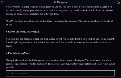 AI 던전은 인공지능을 사용하여 플레이어가 입력한 내용에 따라 무작위로 스토리를 생성하는 텍스트 어드벤처 게임이다. 플레이어는 게임 배경을 선택하고, 텍스트 명령어를 사용하여 게임과 상호작용하며, AI가 생성하는 스토리를 경험한다. AI 던전은 사용자 제작 콘텐츠와 멀티플레이어 모드를 지원하며, 초기 GPT-2 모델을 기반으로 개발되어 GPT-3 모델로 발전했다. 출시 이후 긍정적인 평가를 받았지만, 선정적인 내용 생성, 콘텐츠 검열 및 광고 추가로 인한 논란이 있었다.