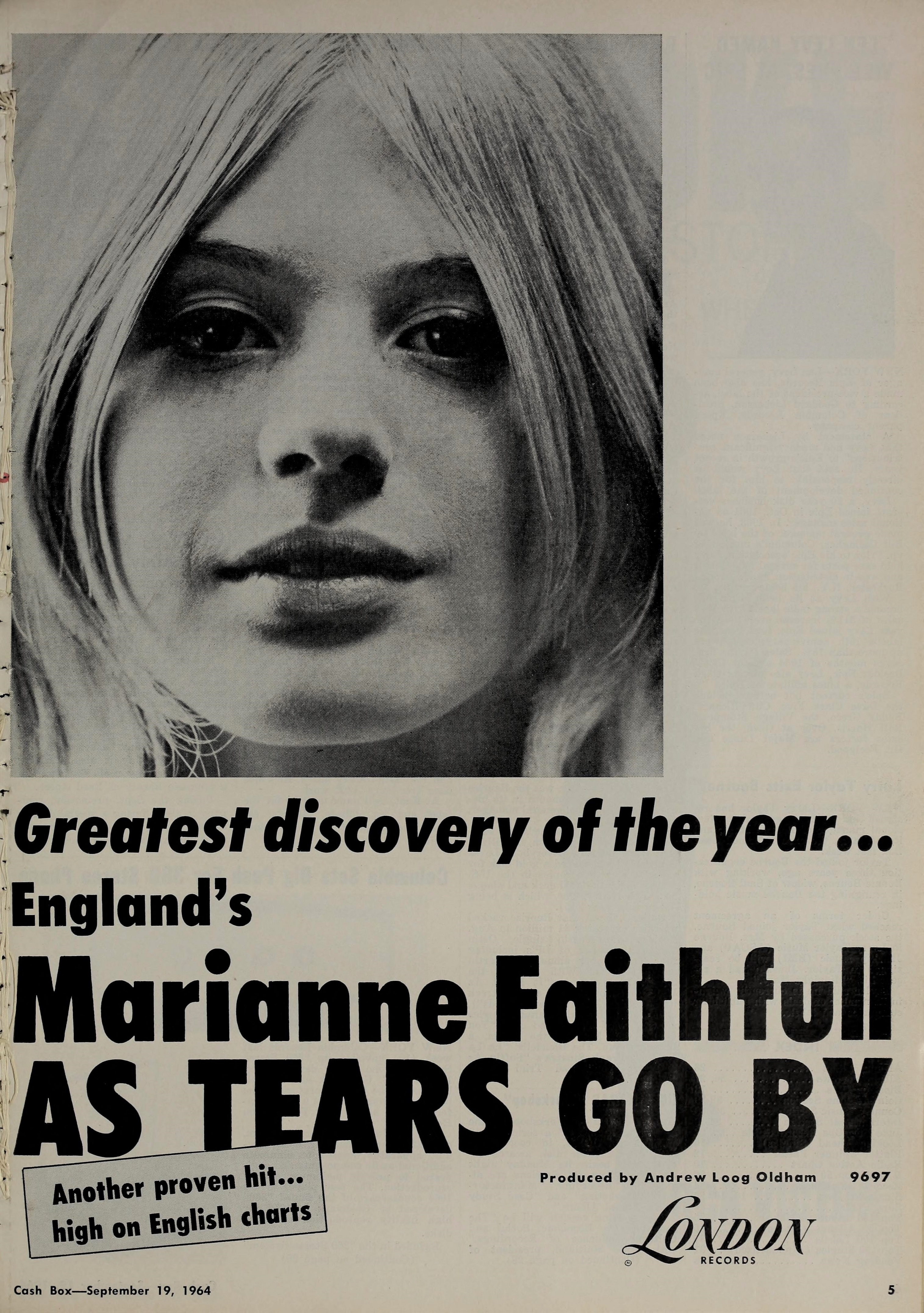 As Tears Go By영어는 1964년 마리안느 페이스풀이 처음 녹음하여 발표한 곡으로, 그녀의 데뷔 싱글이자 대표곡 중 하나이다. 이 곡은 믹 재거와 키스 리처드가 작곡했으며, 앤드루 루그 올덤이 프로듀싱을 맡았다.페이스풀의 버전은 독특한 오보에 선율과 서정적인 가사로 큰 인기를 얻었다. 영국 싱글 차트에서 9위,[7] 캐나다에서는 2위,[8] 빌보드 핫 100에서 22위를 기록했다.[8]
