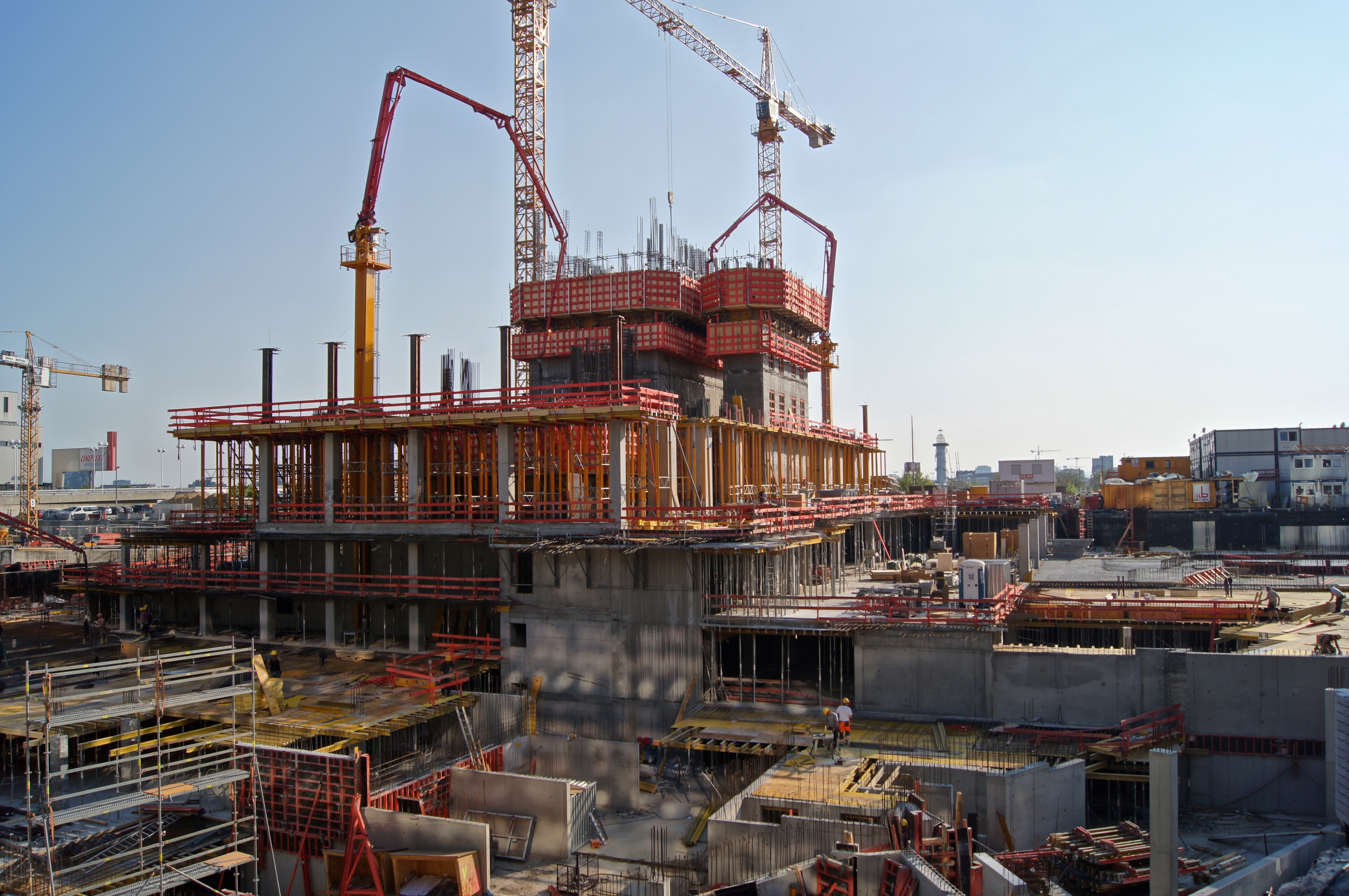 2010년 2월 말부터 비어 있던 부지에서 첫 번째 활동이 시작되었다. 2010년 6월 17일, 초석을 놓고 건설이 시작되었다.[10] 11월에는 첫 번째 말뚝 박기 작업이 시작되었고, 영구적으로 설치된 첫 번째 건설용 크레인이 사용되었다. 12월에는 기초 공사가 이미 한창 진행 중이었다. 다뉴브 강둑 고속도로 A22의 중첩 지점 바로 옆에 위치하고 다뉴브 강과 가깝다는 점을 고려하여 특별한 깊은 기초가 필요했다. 핵심부가 4미터 두께인 기초판 아래로, 다이어프램 벽 말뚝이 건물 부지 안으로 35미터 더 뻗어 있다. 기초판 구역에만 13000m3의 콘크리트가 설치되었다. (이는 1,625대의 콘크리트 믹서 트럭에 해당하는 하중이다) 토목 공사는 6개월 만에 완료되었다.[11][12]
