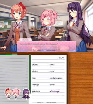 게임 초반에는 문예부 활동으로 시를 짓는 미니 게임이 등장한다. 플레이어는 여러 단어 세트에서 단어를 선택하여 시를 "작문"하며, 각 부원은 서로 다른 단어를 선호한다. 모니카를 제외한 문예부원들은 특정 단어에 긍정적으로 반응한다.[3][4][5][6] 이 미니 게임의 결과에 따라 특정 부원과의 추가적인 이벤트 장면을 볼 수 있다.[5][6]