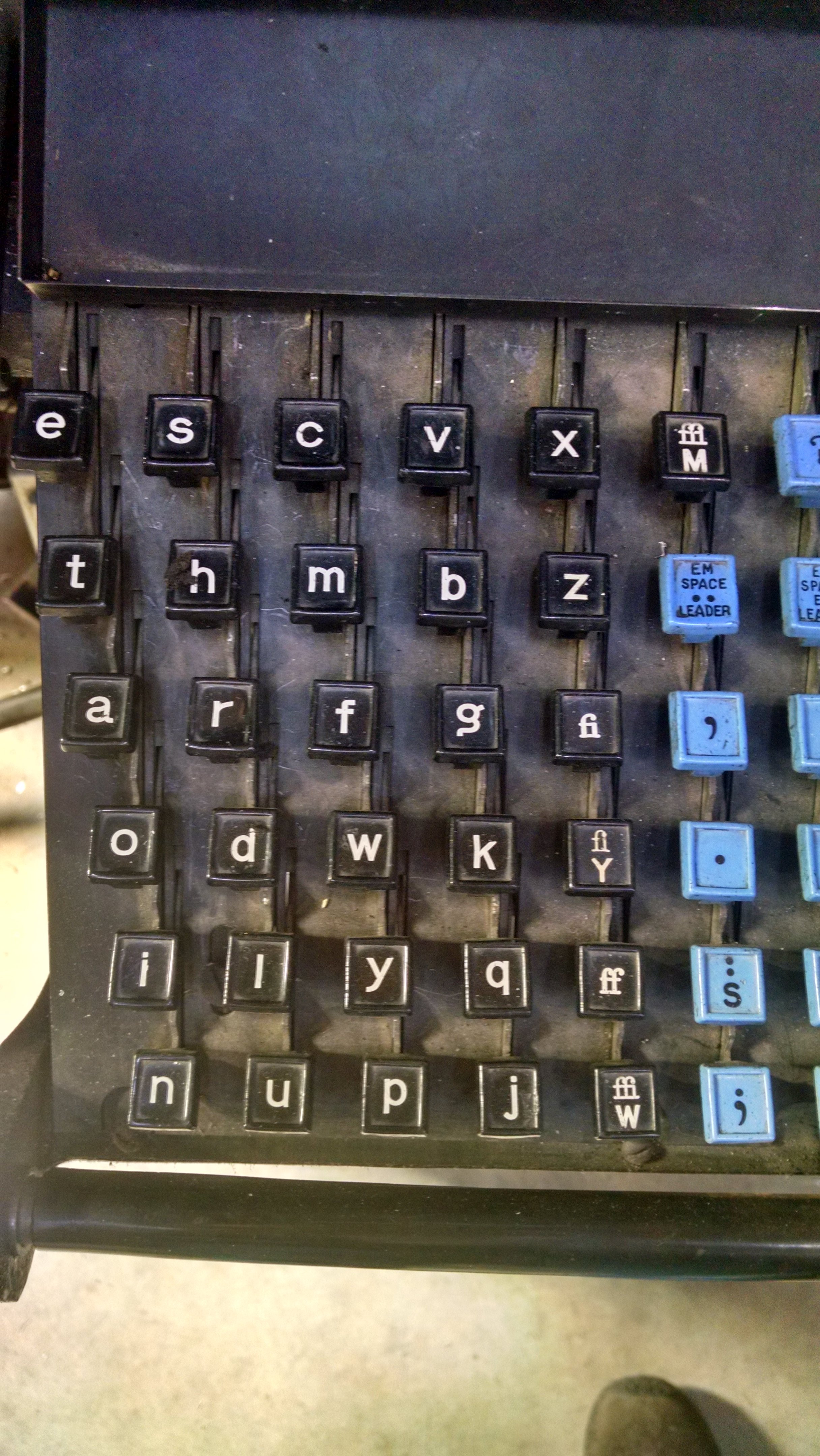 는 키보드 왼쪽 두 열에 위치했다.각 키를 누르면 글자체 매거진의 해당 슬롯에서 금속 '매트릭스'(개별 문자 몰드)가 떨어져 라인 몰드에 추가된다. 한 줄이 주조된 후에는 해당 몰드의 구성 매트릭스가 글자체 매거진으로 반환된다.