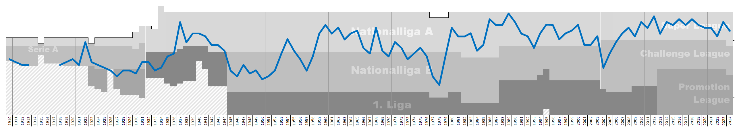 1933년 전국 단일 1부 리그 출범 이후, FC 루체른은 총 17번의 승격과 강등을 반복하며 가장 많은 "이동" 기록을 가진 팀이 되었다.[5]