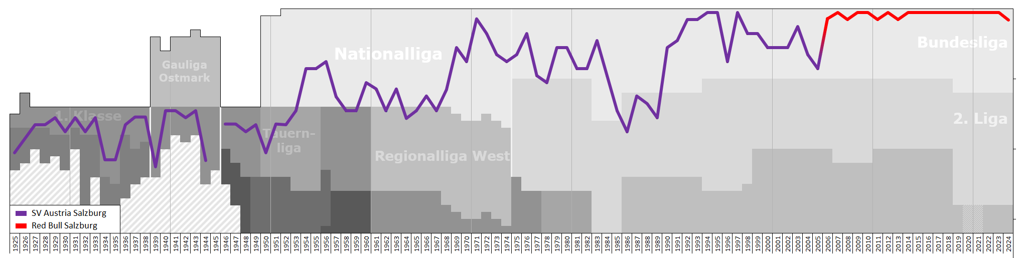 1933년 9월 13일, 잘츠부르크를 연고로 하는 두 축구 클럽 헤르타와 라피트가 합병하여 '''SV 오스트리아 잘츠부르크'''가 창단되었다.[3] 1950년에 클럽이 해체되었다가 같은 해 다시 창단되었다. 1953년에는 오스트리아 분데스리가(당시 리그 명칭은 "Staatsliga")로 승격, 첫 시즌에 14개 클럽 중 9위를 기록하며 5점 차로 강등을 면했다.[4]2. 2. 1953년 ~ 1970년