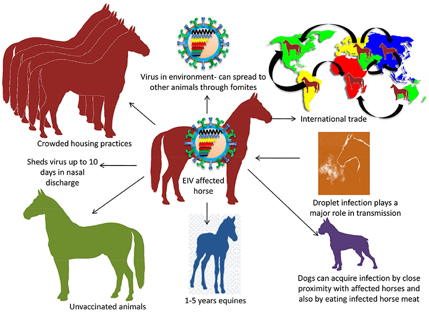 그러나 바이러스는 말 밖에서 오래 생존하지 못하며, 환경 조건에 굉장히 민감하며 열, 추위, 건조, 소독에 의해 쉽게 사멸한다.[29][30][14][15] 백신을 접종한 말에서도 무증상 감염이 나타날 수 있는데, 이는 백신 바이러스주와 전염병 바이러스주 사이의 불일치에서 기인한다. 이로써 질병이 더욱 쉽게 확산된다.[31][17]