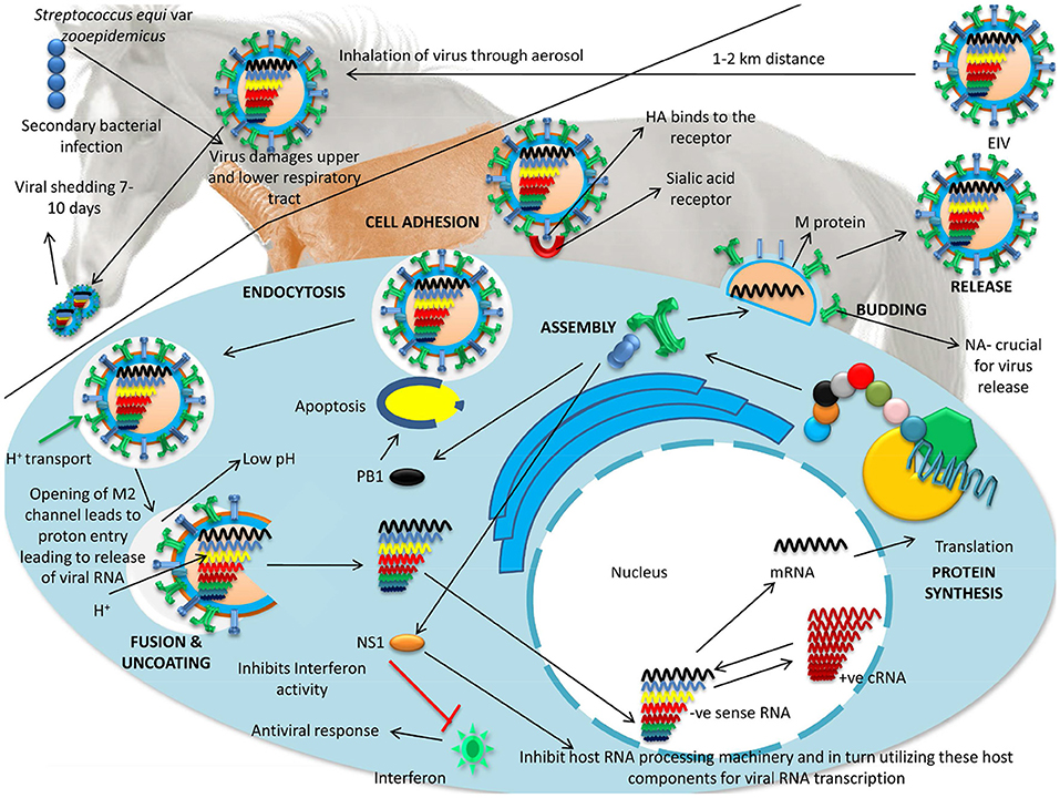 흡입된 H3N8 바이러스는 상부 및 하부 호흡기의 호흡 점막에 자리 잡는다. 바이러스는 호흡 점막을 덮고 있는 점액의 당단백질과 뮤코다당류에 끌린다.[6] 바이러스의 감염 용량이 높으면 풍부한 바이러스 뉴라미니다제가 점막층을 분해하여 바이러스가 기저 상피 세포에 접근할 수 있게 한다.[6] 그런 다음 바이러스는 세포의 혈구응집소 스파이크가 세포의 N-아세틸뉴라민산 수용체에 결합하여 상피 세포에 부착된다.[6] 바이러스는 엔도사이토시스를 통해 세포질로 들어가 복제하여 감염된 세포에서 출아를 통해 호흡기로 다시 방출되는 새로운 비리온을 생성한다.[6]