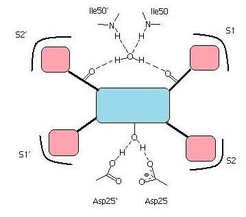 HIV 단백질분해효소 억제제에서 구조적으로 매우 중요한 부분은 핵심 모티프에 있는 수산기이다. 이 수산기는 효소의 활성 부위에 위치한 Asp25와 Asp25' 잔기의 카르복실산과 수소 결합을 형성하는데, 이는 억제제의 작용에 핵심적인 역할을 한다.[16][27] 펩티도모방 억제제의 경우, 카르보닐 그룹과 물 분자, 그리고 효소의 플랩(flap) 영역에 있는 Ile50과 Ile50' 잔기 사이에 형성되는 수소 결합이 억제제를 효소에 고정시키는 데 기여하는 것으로 보인다.[19] 반면, 비펩티드 억제제는 4배위 물 분자를 대체하고 효소 플랩의 두 Ile50 잔기와 직접 상호작용하는 양성자 수용체를 가지고 있다.[28]