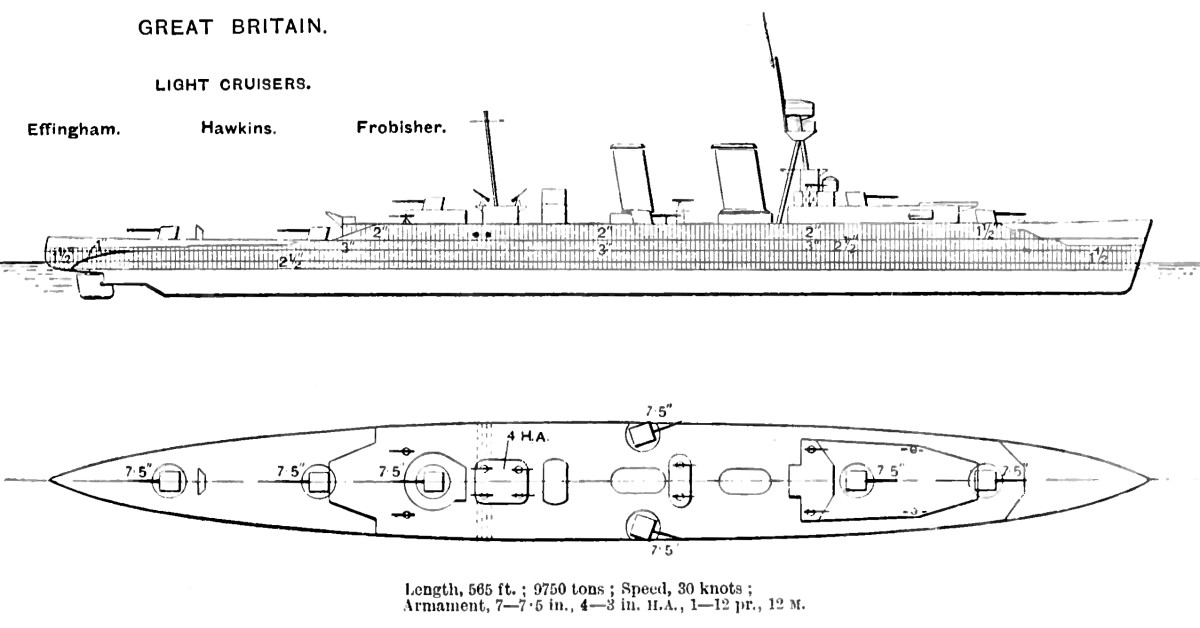 HMS 호킨스는 파슨스 증기 터빈 4개로 구동되었으며, 각각의 터빈은 12개의 야로 보일러에서 나오는 증기를 이용해 하나의 구동축을 움직였다. 60,000 샤프트 마력(45,000 kW)을 내도록 설계되어 최대 30노트(56 km/h)의 속도를 낼 수 있었다. 해상 시험에서는 61000shp에서 28.7노트(53.2 km/h)를 기록했다.[41] HMS 호킨스는 10노트(19 km/h)의 속도로 5,640해리(10,450km)를 항해할 수 있었다.[42]2. 3. 무장