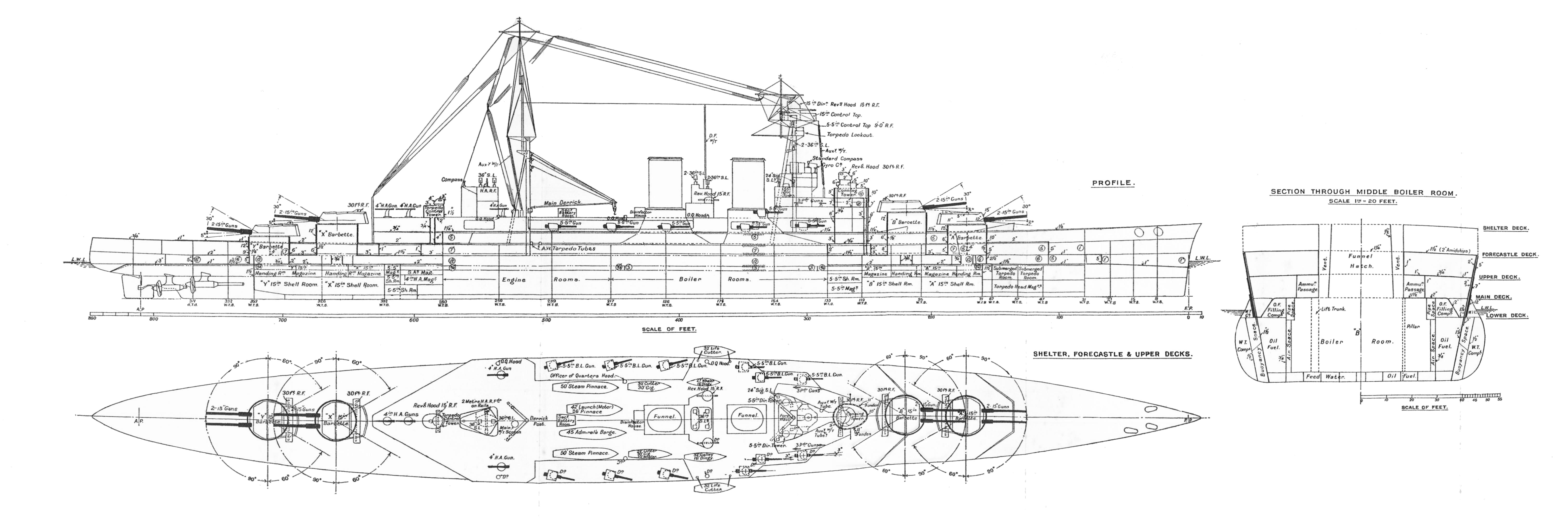 약 30.48cm 장갑 아래의 수선하 장갑은 76mm까지 얇아졌으며, 그 아래에서 함저부까지는 38mm까지 얇아졌다. 어뢰 방어로서 수선부 장갑 아래에는 벌지가 설치되었으며, 그 구조는 액체층과 공기층에 38mm 장갑을 끼운 안쪽이 연료 탱크의 삼중 구조로 되어 있었고, 그 안쪽의 수밀 격벽에는 18mm 장갑이 부착되었다. 이중 바닥의 내부에는 물 또는 연료가 채워져 있었다.