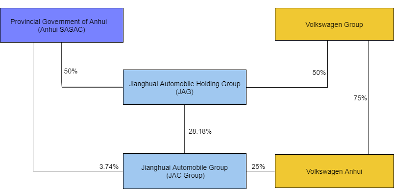 2017년에는 폭스바겐 그룹과 전기 자동차 생산을 위한 합작 투자를 발표했다. 처음에는 폭스바겐 산하의 SEAT 브랜드를 활용할 계획이었으나, 2018년 4월 공식 출범한 JAC-폭스바겐 합작 투자는 새로운 브랜드인 솔(Sol)을 통해 운영되었다. 첫 모델인 SOL E20X는 JAC iEV40 (또는 JAC Refine S2 EV)를 기반으로 스페인 SEAT 스타일 센터에서 전면 디자인을 변경한 전기 크로스오버 차량이다. 2020년, 폭스바겐 그룹은 JAC 폭스바겐 합작 투자의 지분을 기존 50%에서 75%로 늘리고, JAC의 모회사이자 안후이성 정부 소유인 JAG(JAC 홀딩 그룹)의 지분 50%를 인수하는 내용의 양해 각서를 체결했다. 이 거래는 약 10억유로 규모로, 연말까지 완료될 예정이었다.[17] 이로 인해 폭스바겐 그룹은 폭스바겐 안후이(JAC-폭스바겐의 새 이름) 지분 75%와 JAG 지분 50%를 소유하게 되었으며, 결과적으로 폭스바겐 안후이에 대한 실질적인 소유 지분율은 78.52%에 달하게 되었다.