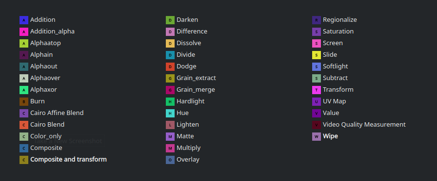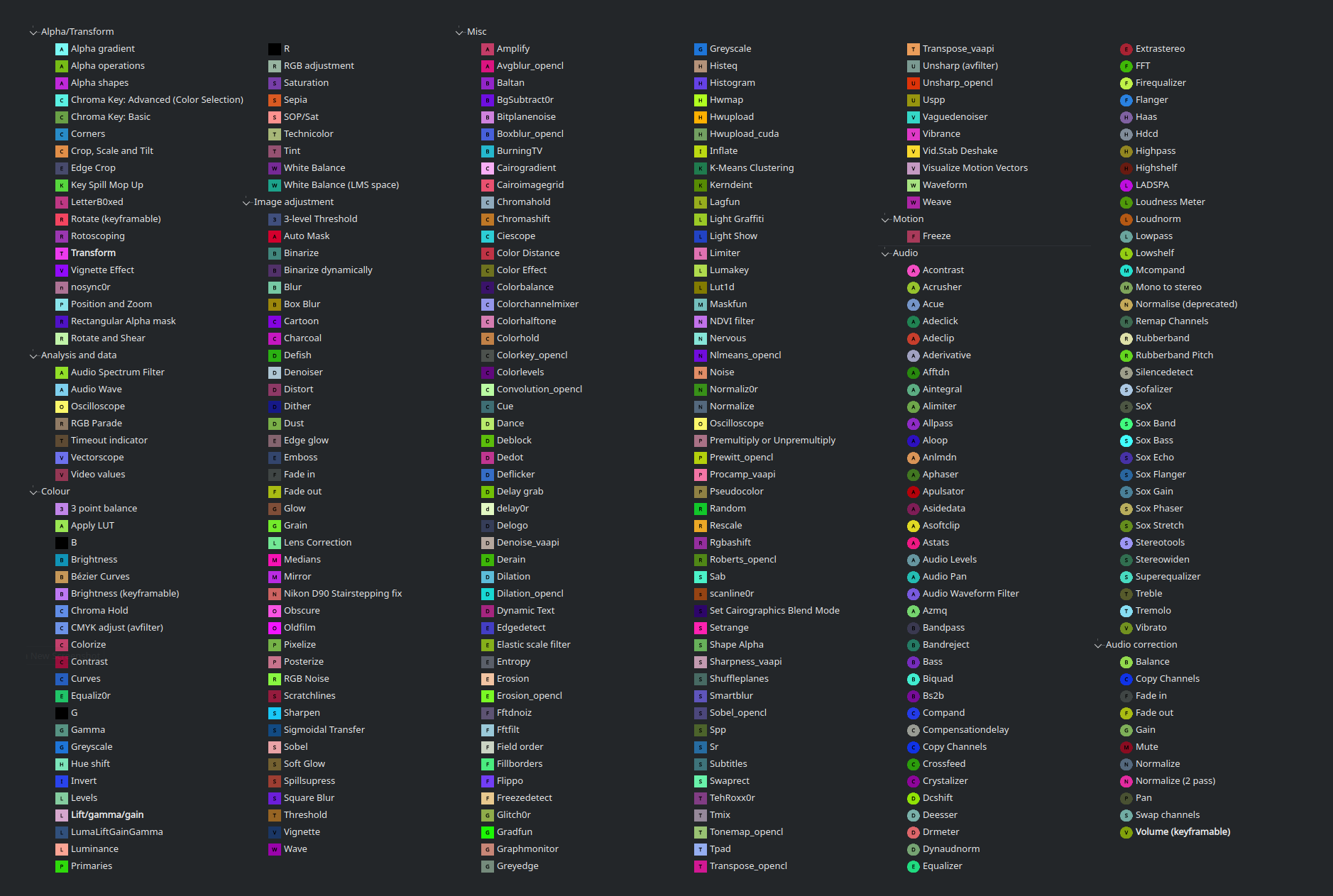 - 광범위한 효과와 전환 기능이 제공된다. 오디오 신호 처리 기능에는 정규화, 위상 및 피치 시프트, 리미팅, 볼륨 조정, 리버브 및 이퀄라이제이션 필터 등이 포함된다. 시각 효과에는 마스킹, 블루 스크린, 왜곡, 회전, 색상 도구, 흐림, 가리기 등의 옵션이 포함된다.