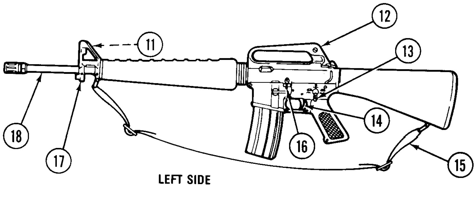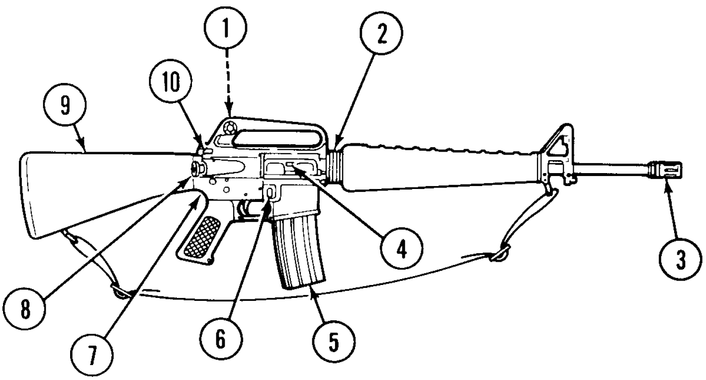 602 | AR-15 (1963년 12월 3일 M16으로 지정 - XM16은 없었음) | A1 프로필 (1:12 비틀림) | 전장 삼각형 | 고정식 A1 | A1 | A1 | A1 | A1 | A1 | 덕빌 또는 삼발이 플래시 서프레서 | 아니오 | 세이프/세미/오토 |