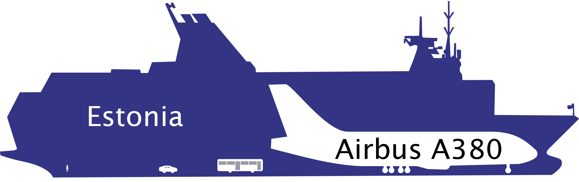 MS ''Estonia'', 사람, 자동차, 버스 및 에어버스 A380의 크기 비교