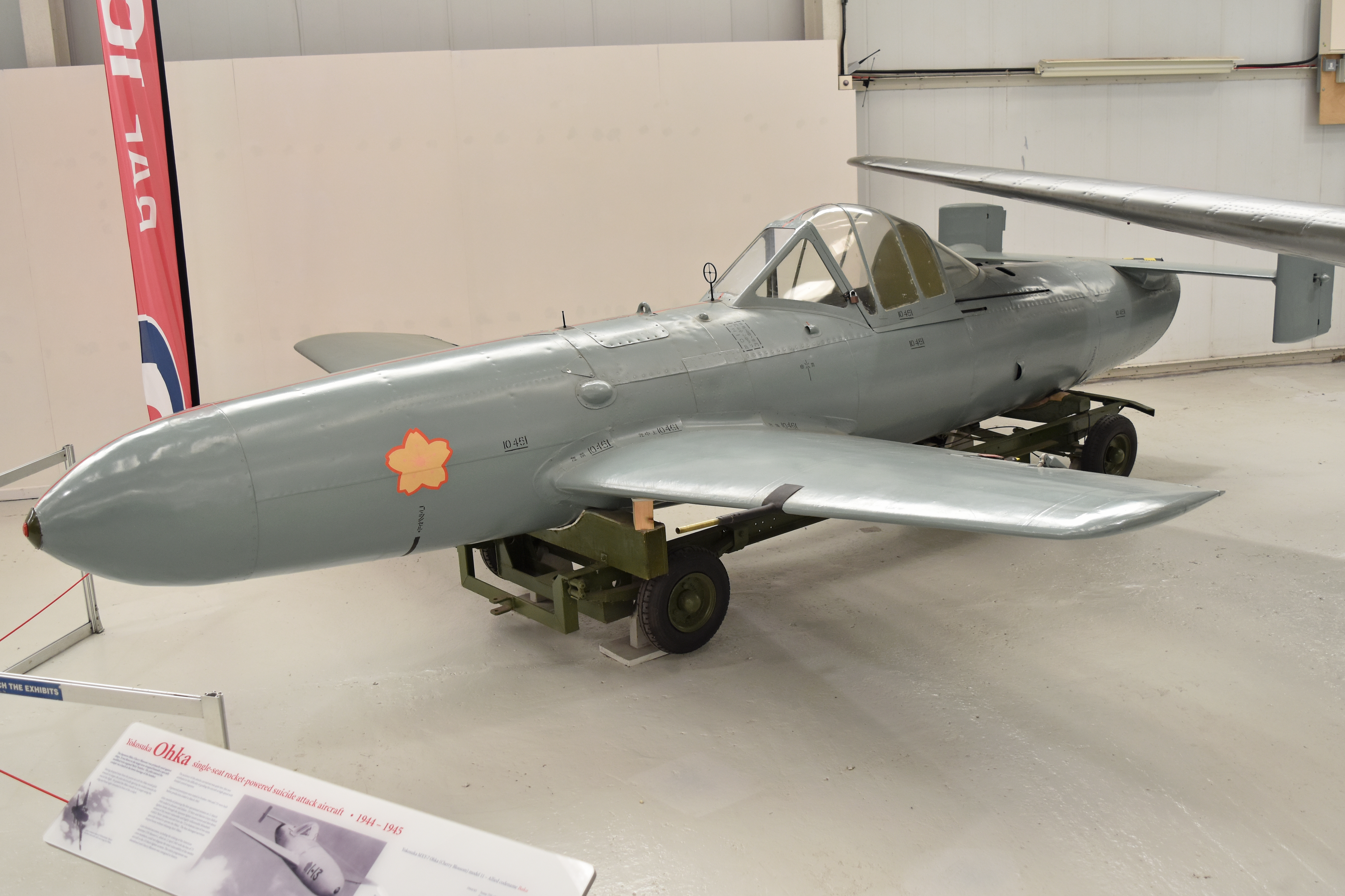 - '''오카 Model 11''': 3 × 해군 4형 1호 20형(Navy Type 4 Mark 1 Model 20) 고체 연료 로켓 모터로 추진되며, 8~10초 동안 발사됨; 755대 제작 실전에 투입된 기체로, 55기가 특공에 출격했다.[211] 일식 육공 24형을 개조한 기체에 탑재되어 운반 후 발진하는 방식을 사용했다. 로켓 엔진은 30초 정도의 가속이 가능했으며, 탑승원의 판단에 따라 사용되었다.[212]