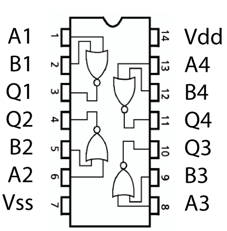 표준 4000 시리즈 CMOS IC인 4001은 4개의 독립적인 2입력 NOR 게이트를 포함한다. 핀 배열은 다음과 같다.{| class="wikitable"