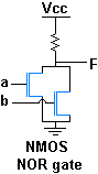 위의 그림은 NMOS 논리 회로를 사용하는 2입력 NOR 게이트의 구성을 보여준다. 입력 중 하나라도 높으면(HIGH, 1) 해당 N 채널 MOSFET이 켜지고 출력이 낮아진다(LOW, 0). 그렇지 않으면 출력은 풀업 저항을 통해 높아진다(HIGH, 1).[1]