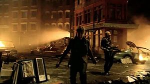비버(왼쪽)와 브라운이 뮤직 비디오에서 파괴된 건물들 사이에서 노래하고 춤을 춘다.