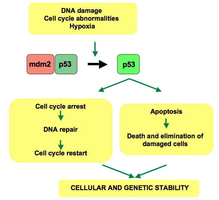 p53은 세포자살, 유전체 안정성에 관여하며 혈관 신생을 억제하는 등 다양한 항암 작용 메커니즘을 가진 단백질이다. p53은 DNA 손상 시 DNA 수선 단백질을 활성화하고, 세포주기를 G1/S 단계에서 정지시키며, 손상이 복구 불가능할 경우 세포자살을 유도한다.[239]활성화된 p53은 DNA에 결합하여 miR-34a microRNA를 포함한 여러 유전자를 발현시킨다.[239] WAF1/CIP1에 의해 암호화되는 p21은 G1-S/CDK 및 S/CDK 복합체에 결합하여 세포주기 진행을 억제한다. p53 유전자에 돌연변이가 발생하면 DNA 결합 능력이 저하되어 세포주기 정지 신호를 제대로 전달하지 못하게 된다.[240]