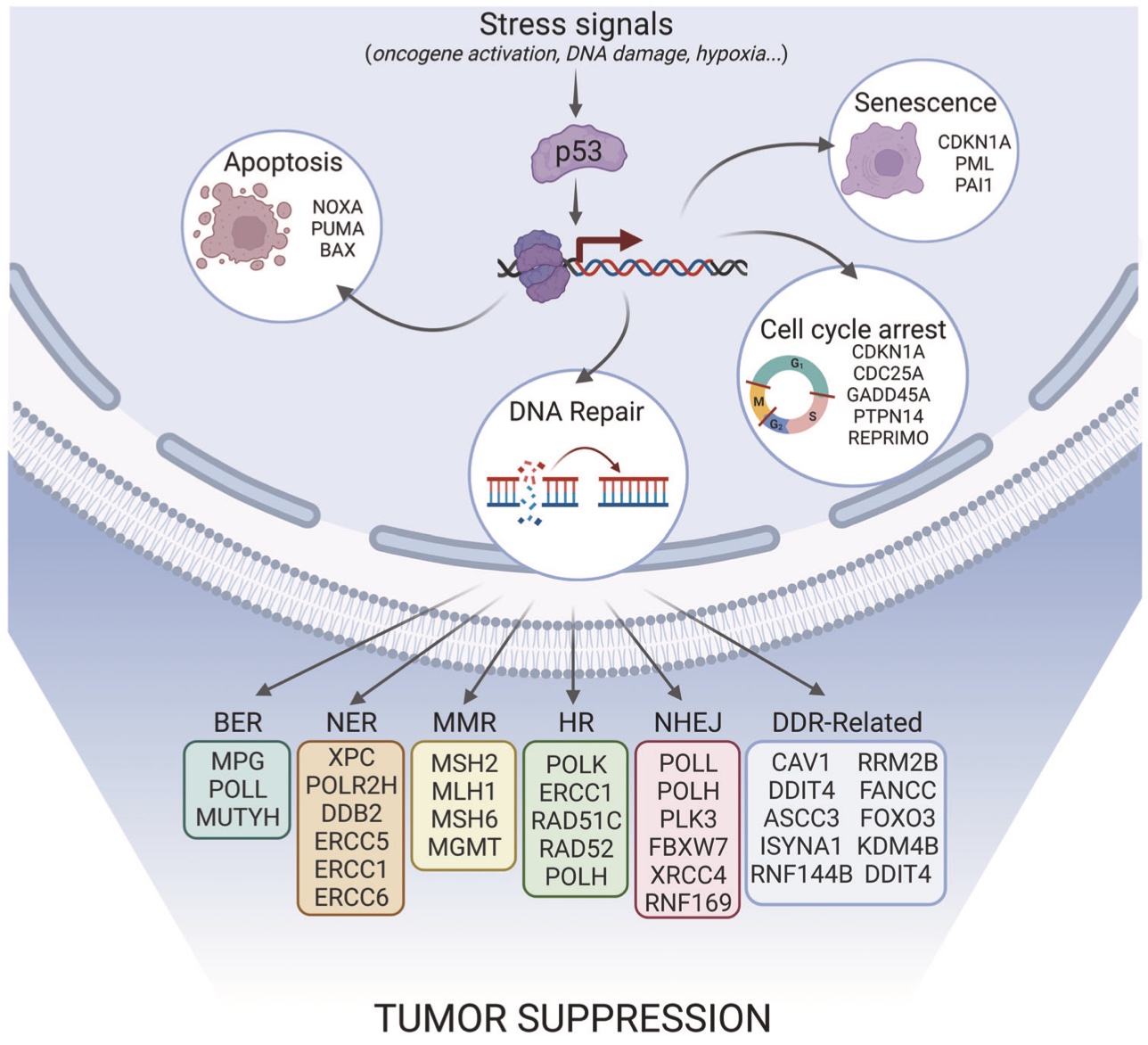 p53은 다양한 항암 작용 메커니즘을 가지며, 세포자살, 유전체 안정성 유지, 혈관 신생 억제 등의 역할을 한다.[2]