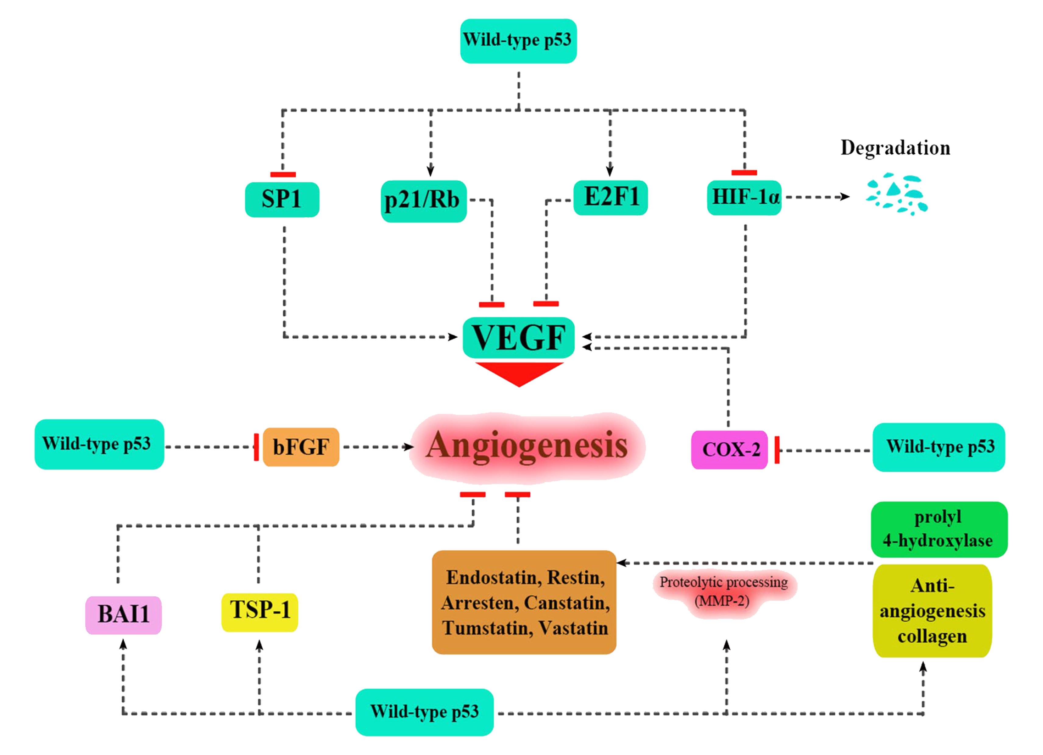 p53은 조직 수준에서 혈관 신생을 억제하여 항암 효과를 나타낸다.[2] 종양이 성장하기 위해서는 새로운 혈관이 필요하다. p53은 다음의 방법으로 신생 혈관 생성을 억제한다.[36][37]