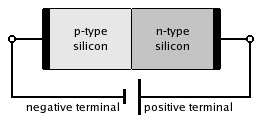 - '''순방향 바이어스''': P형 영역에 (+) 전압, N형 영역에 (-) 전압을 가하면 확산 전류가 증가하여 전류가 흐른다.