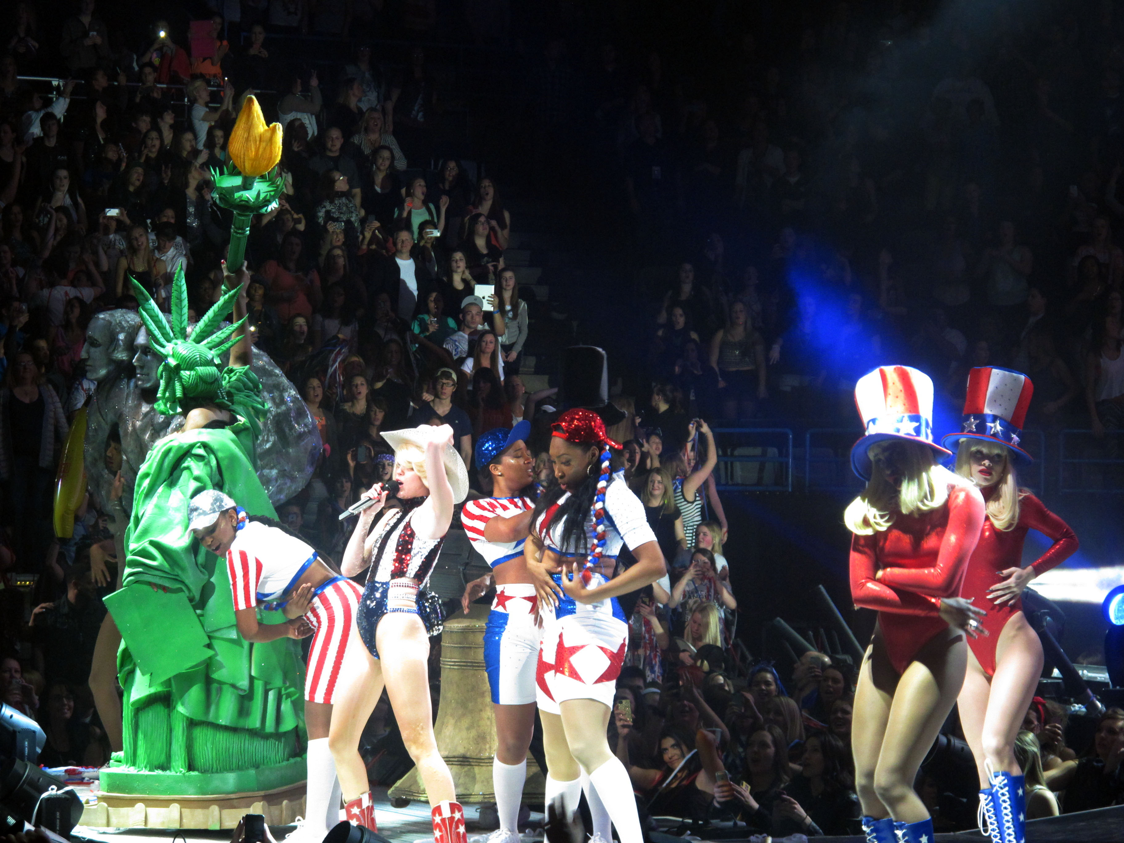 뱅거즈 투어(Bangerz Tour)에서 "Party in the U.S.A."를 공연하는 사이러스. 러시모어 산(Mount Rushmore), 자유의 여신상(Statue of Liberty), 자유의 종(Liberty Bell)을 포함한 다양한 미국 관련 자료가 등장한다.