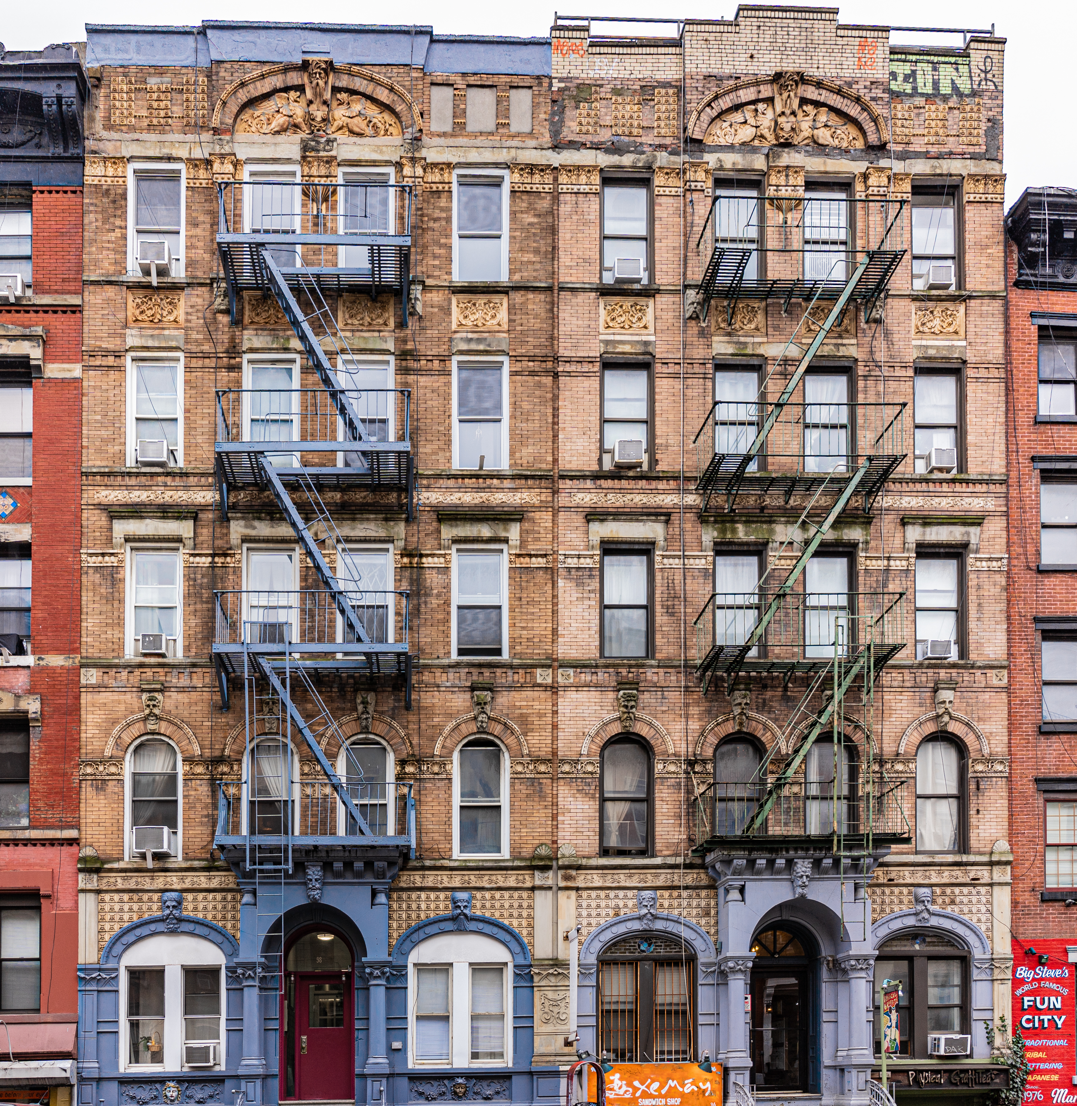 뉴욕 테넌트 블록의 갈색 사암 건물 정면