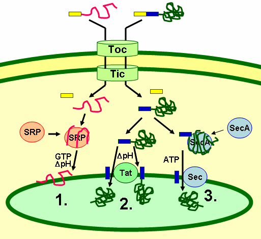 세포질에서 단백질이 엽록체로 이동하라는 신호를 보내는 수송 펩타이드가 노출된다. 이 신호는 TIC/TOC 복합체를 통해 엽록체의 스트로마로 단백질이 수송 및 자리옮김을 시작하게 한다. 스트로마에 들어온 단백질은 신호 펩티데이스에 의해 수송 펩타이드가 절단되고, 이로 인해 아래에 있던 두 번째 수송 펩타이드 서열이 드러난다. 이 두 번째 서열은 틸라코이드 막으로 향하게 한다.[9]