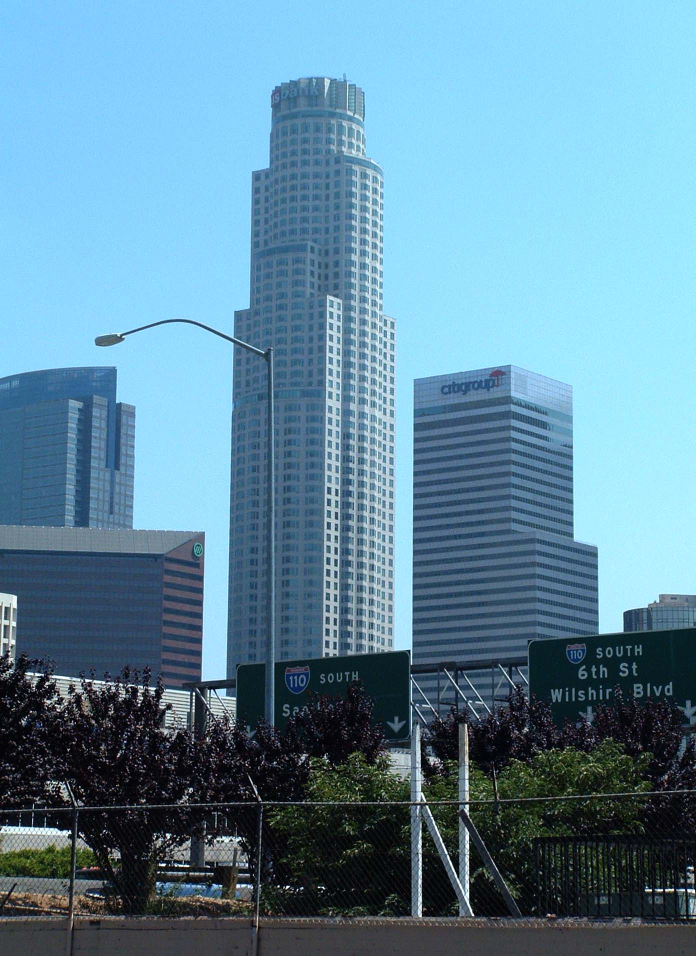 이 건물은 1986년 도서관에서 두 차례의 큰 화재가 발생한 후 10억달러 규모의 로스앤젤레스 중앙도서관 재개발 지역의 일부로 건설되었고, 도서관 맞은편에 위치해 있기 때문에 처음에는 도서관 타워(Library Tower)로 알려졌다.[16] 로스앤젤레스 시는 타워 개발업체에 항공권(공중권)을 매각하여 도서관 재건축 비용을 충당했다. 이 건물은 한때 퍼스트 인터스테이트 뱅크 월드 센터(First Interstate Bank World Center)로도 알려졌지만, 퍼스트 인터스테이트 뱅코프(First Interstate Bancorp)가 웰스파고 은행(Wells Fargo Bank)과 합병된 후 도서관 타워(Library Tower)라는 이름으로 복원되었다.3. 3. U.S. 뱅크 타워 (U.S. Bank Tower)